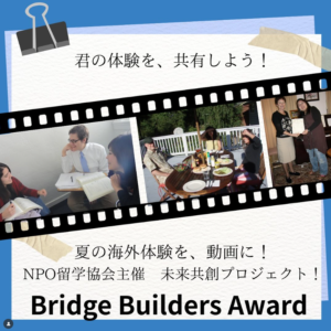 お知らせ/バスケ留学/日本赤十字/留学準備/米国通信制高校卒業 “Bridge Builders Award”開催! 2025年8月8日 by InternationalAJ 未来共創プロジェクト・君が紡ぐ未来 NPO留学協会主催第一回 “Bridge Builders Award”開催! 海外経験を基にした社会課題への取り組みを、具体的かつ論理的に示す発表の場です。 世界を見た高校生たちが、自分の経験を武器に、社会課題に立ち向かう。3~5分の動画で、「未来を紡ぐ物語」 を発信しよう。 対象:高校生内容:海外経験をもとにした社会課題への取り組み形式:3~5分の動画プレゼン 詳細・応募はこちら 特定非営利活動法人 留学協会 〒101-0052 東京都千代⽥区神⽥⼩川町3-6-10 MOビル201TEL 03-5282-8600 JRC, JRC部, Penn Foster High School, Utah Tech, アメリカの大学単位, アメリカの大学履修, アメリカ通信制高校, オンラインハイスクール, ダブルディプロマ, フリースクール, ペンフォスター, 両方卒業, 中学校卒業後の進路, 円安, 卒業, 大学単位取得, 学校説明会, 日本赤十字, 日本赤十字社, 日本赤十字社神奈川支部, 桜木町, 横浜, 海外の高校卒業, 物価高, 留学準備講座, 米国通信制, 米国通信制高校, 通信制高校, 通信制高校卒業, 高校留学 InternationalAJ
